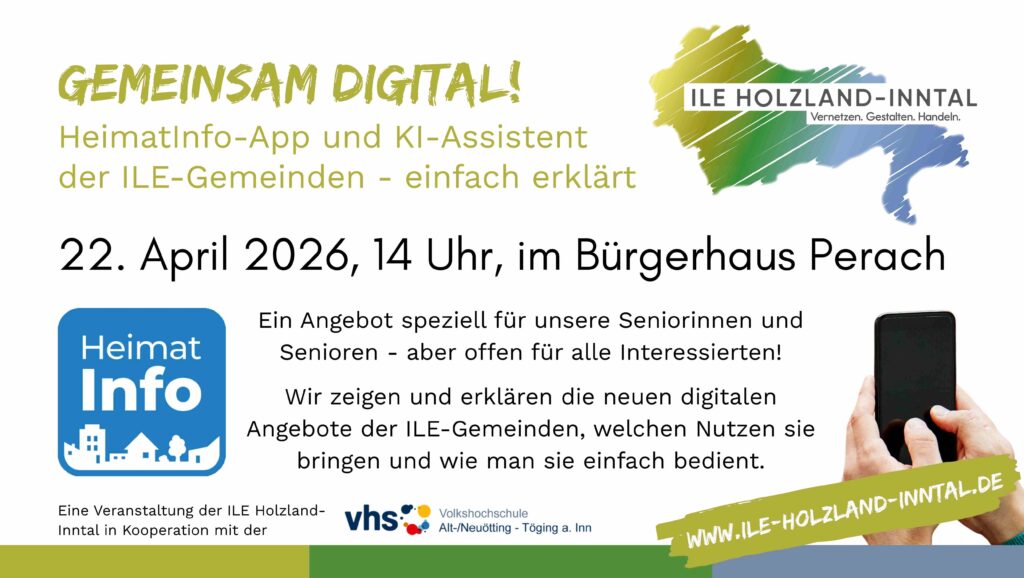 Die ILE Holzland Inntal lädt am Mittwoch, 22. April 2026, um 14 Uhr zu einer Informations- und Mitmachveranstaltung rund um die neuen digitalen Serviceangebote der sechs ILE Gemeinden Erlbach, Marktl, Perach, Reischach, Stammham und Winhöring ein. Im Bürgerhaus Perach, Kirchgasse 8 in Perach, erhalten Interessierte – besonders die Generation 55+ – bei der Veranstaltung in Kooperation mit der VHS Alt-/Neuötting Töging e.V. eine verständliche Einführung in die HeimatInfo App sowie den neuen digitalen Helfer auf den Gemeinde-Webseiten. Der KI Assistent beantwortet rund um die Uhr Fragen zu Öffnungszeiten, Formularen und Gemeindeangelegenheiten. Beide Anwendungen erleichtern den Zugang zu wichtigen kommunalen Informationen und Behördengängen bequem von zuhause aus.
