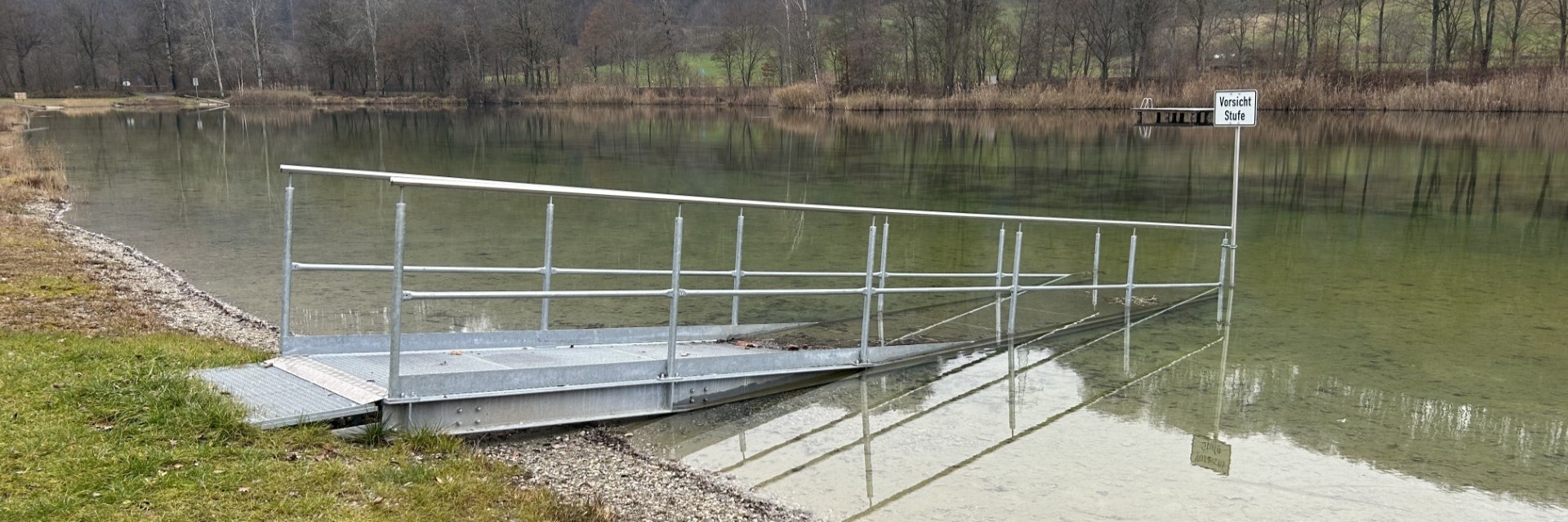 Am beliebten Reischacher Badesee gibt es seit 2023 eine Einstiegshilfe. Eine flache, rutschfeste Rampe mit Geländer ermöglicht so einen sicheren Zugang in den See.